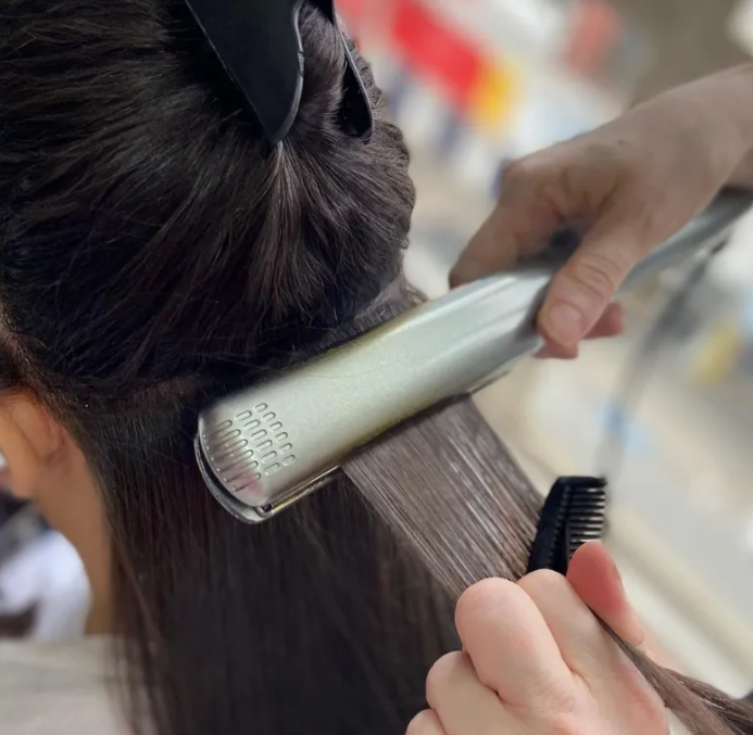 4. Deslize a chapinha da raiz até as pontas de forma contínua e uniforme.