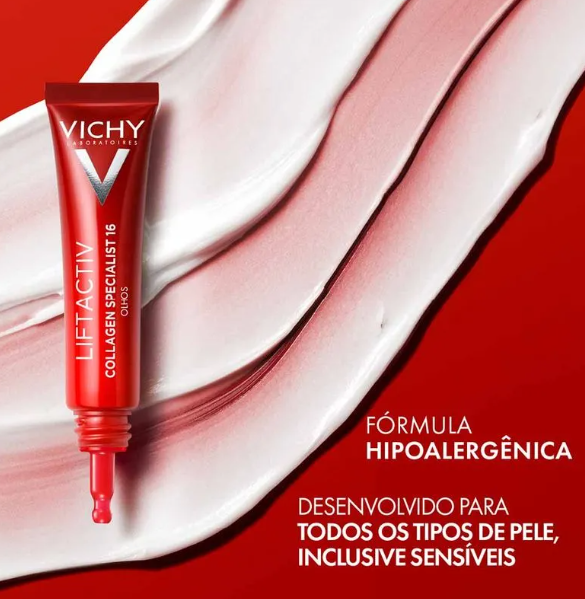 O Creme para Contorno dos Olhos Vichy Liftactiv Colágeno Specialist 16 15 ml age na região delicada ao redor dos olhos estimulando a produção de colágeno e ajudando a suavizar sinais visíveis de envelhecimento. A textura leve e de rápida absorção penetra facilmente sem deixar a pele oleosa ou pegajosa, trazendo conforto e sensação de frescor. Com o uso regular manhã e noite, o produto contribui para melhorar firmeza, elasticidade e textura da pele, reduzindo linhas finas, rugas, olheiras e inchaço — além de ajudar a uniformizar o tom e devolver viço ao olhar.
