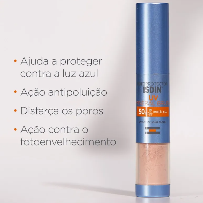 O Protetor Solar Facial Isdin UV Mineral Brush FPS50 2g é uma solução prática e moderna para reforçar a proteção solar ao longo do dia. Sua textura em pó ultrafina, com filtros 100% minerais, oferece acabamento leve e confortável, ajudando a reduzir o brilho sem pesar na pele. O formato em pincel facilita a aplicação em qualquer lugar, permitindo reaplicação rápida inclusive sobre a maquiagem. A ISDIN é reconhecida internacionalmente por sua excelência em fotoproteção, garantindo segurança, eficácia e praticidade para a rotina diária.